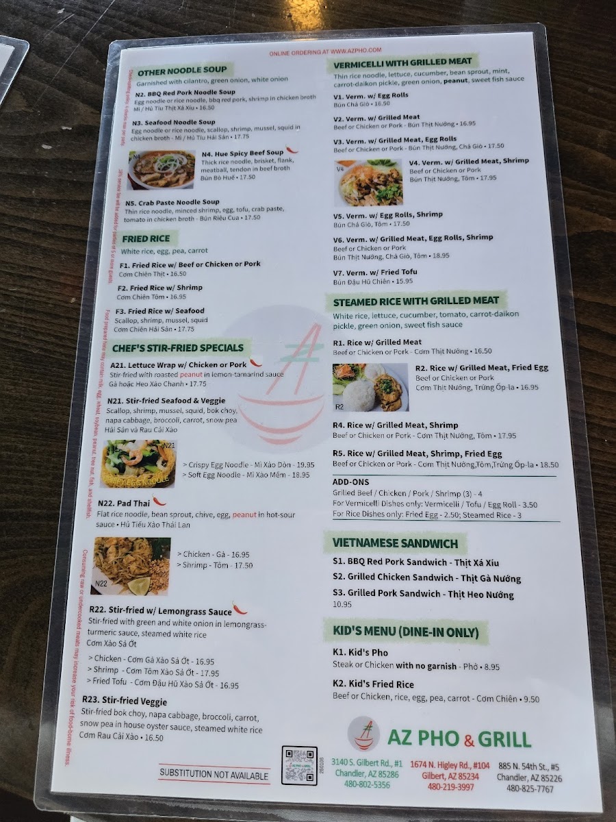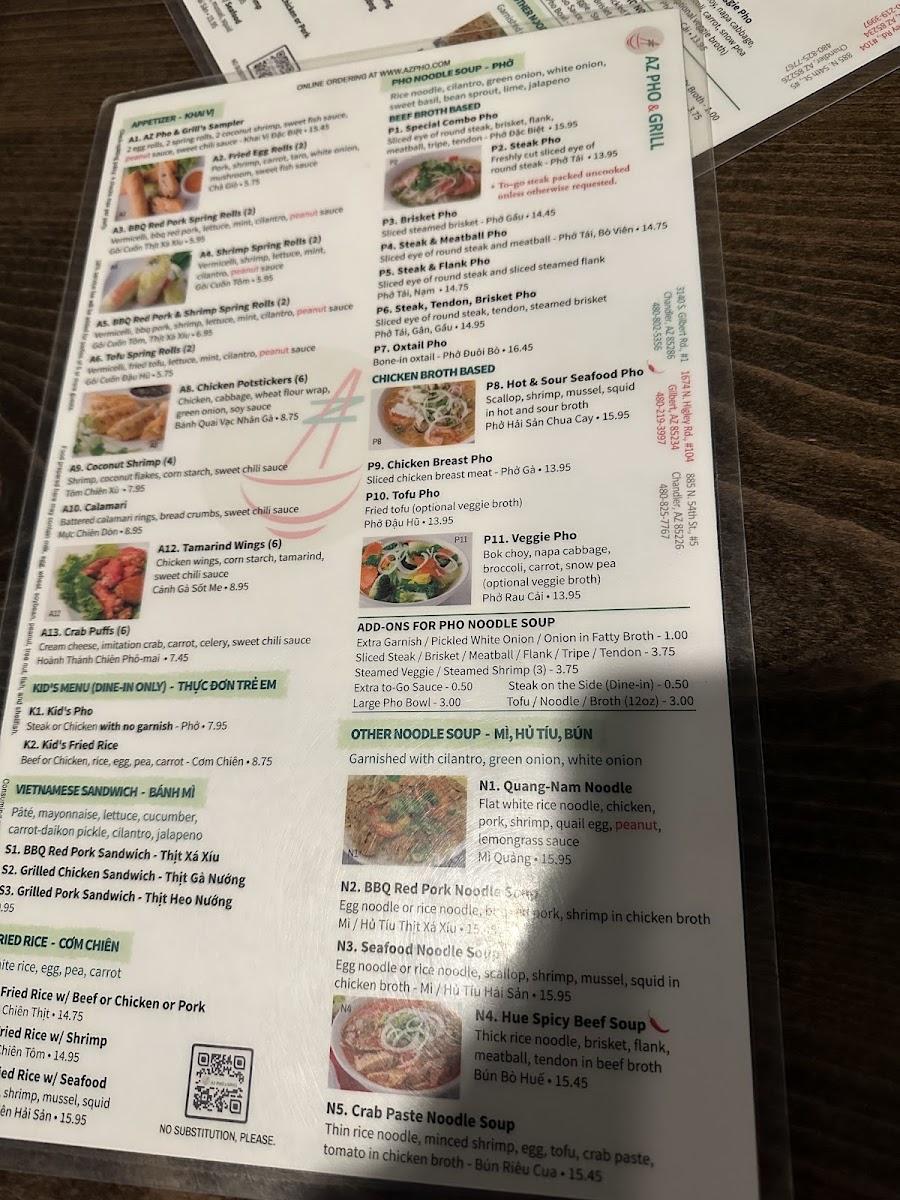 Welcome to AZ Pho & Grill, a fantastic culinary gem located at 1674 N Higley Rd, Gilbert, AZ. The menu shines with a diverse array of Vietnamese delights, offering dishes that reflect authenticity and freshness. Dive into their signature Pho Noodle Soup, celebrated for generous portions of tender meats and vibrant noodles. Diners rave about the spicy seafood pho, which is rich and flavorful. The appetizers, including BBQ Red Pork & Shrimp Spring Rolls and Calamari, are perfect for sharing or savoring solo.